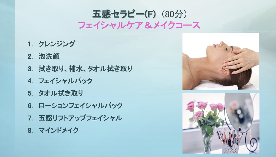 1、五感癒しセラピー(F) フェイシャルケア&メイクコース(80分)