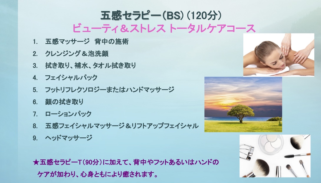 3、五感癒しセラピー(BS) ビューティー&ストレストータルケアコース(120分)