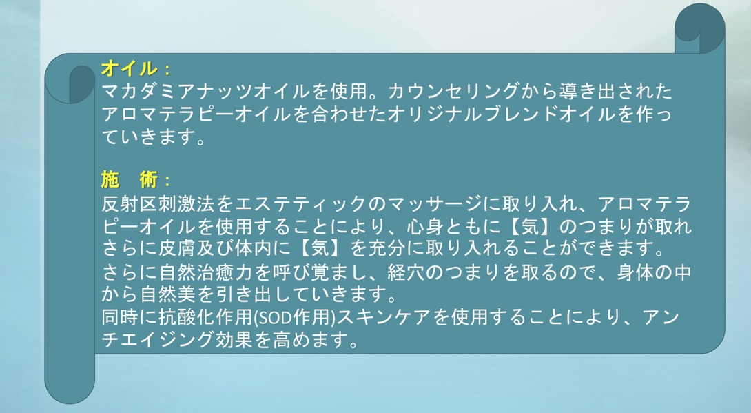 2、五感癒しセラピー (T) ビューティー・トータルケア(90分)